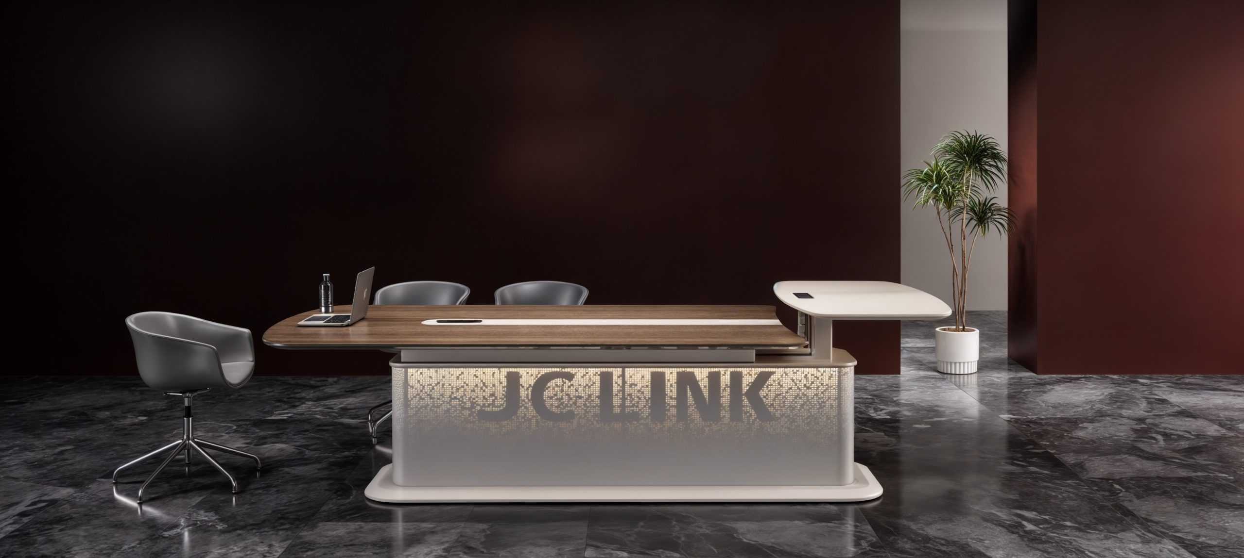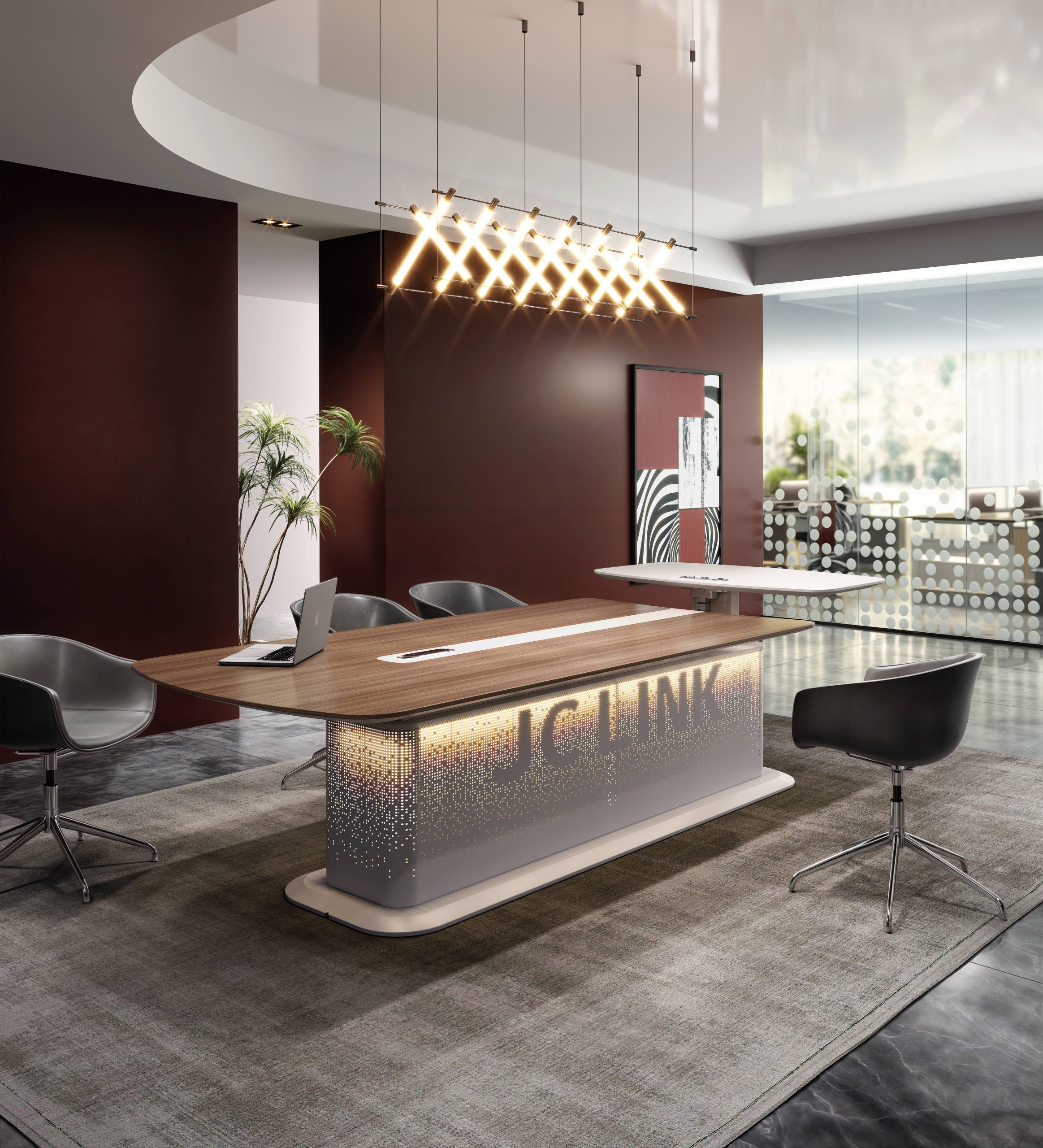 Create collaboration with modern aesthetics and timeless elegance. The Galaxy Conference Table breaks away from conventional heaviness through its clean lines and refined proportions, bringing a sense of openness and sophistication to the meeting space. The height-adjustable design and customizable logo light strip merge technology with artistry, shaping a new vision of contemporary executive communication.