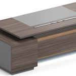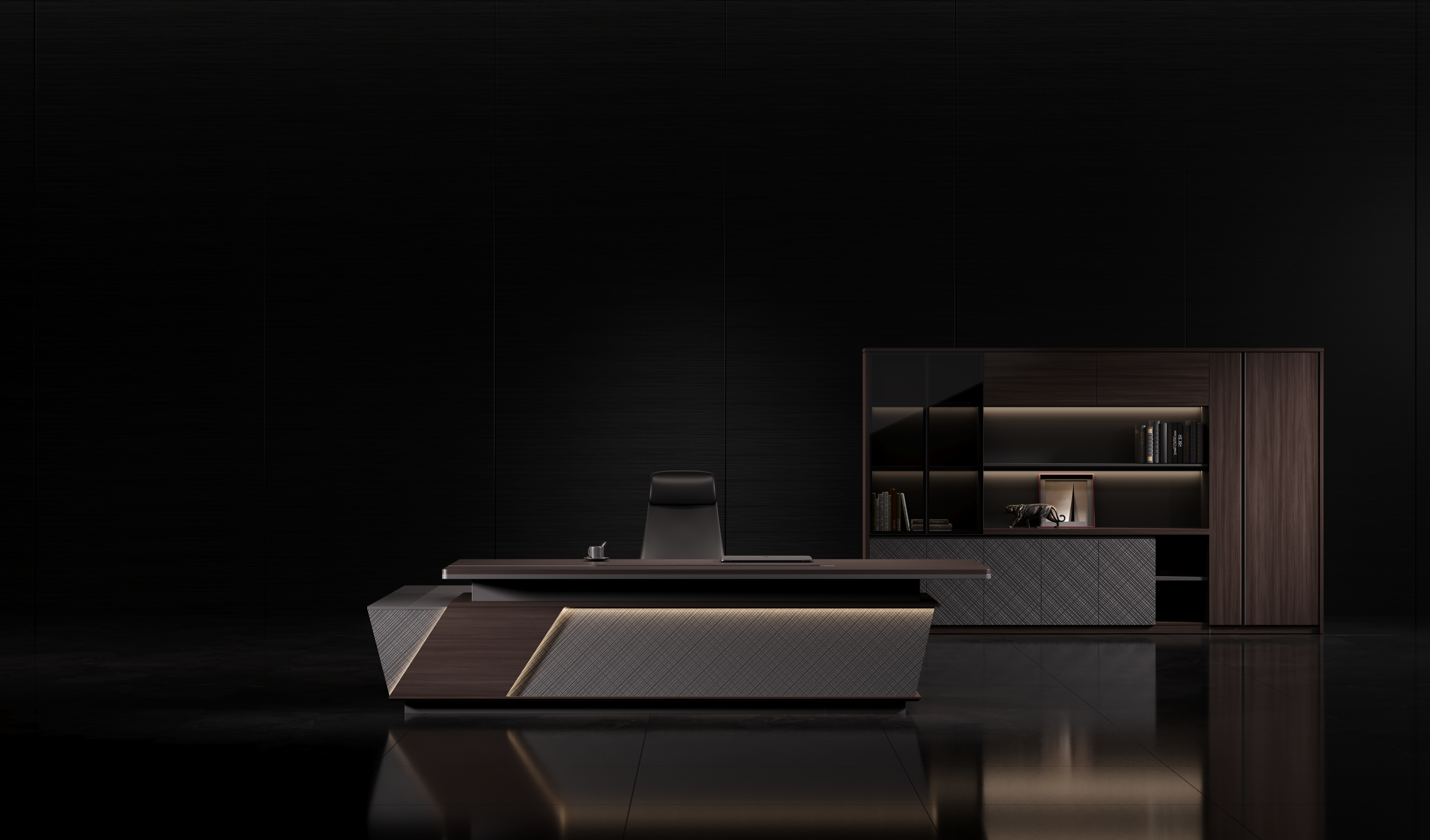 Constructed from eco-certified E0-grade engineered wood with a genuine German Schattdecor veneer finish, the desk features precision-beveled edges and rounded corners. The design focuses on functional executive furniture with understated aesthetics.