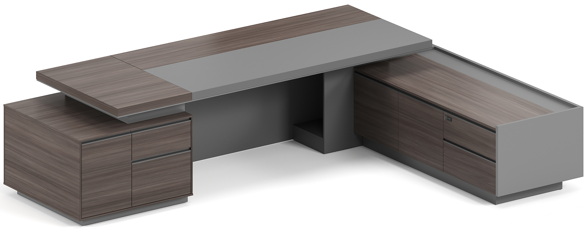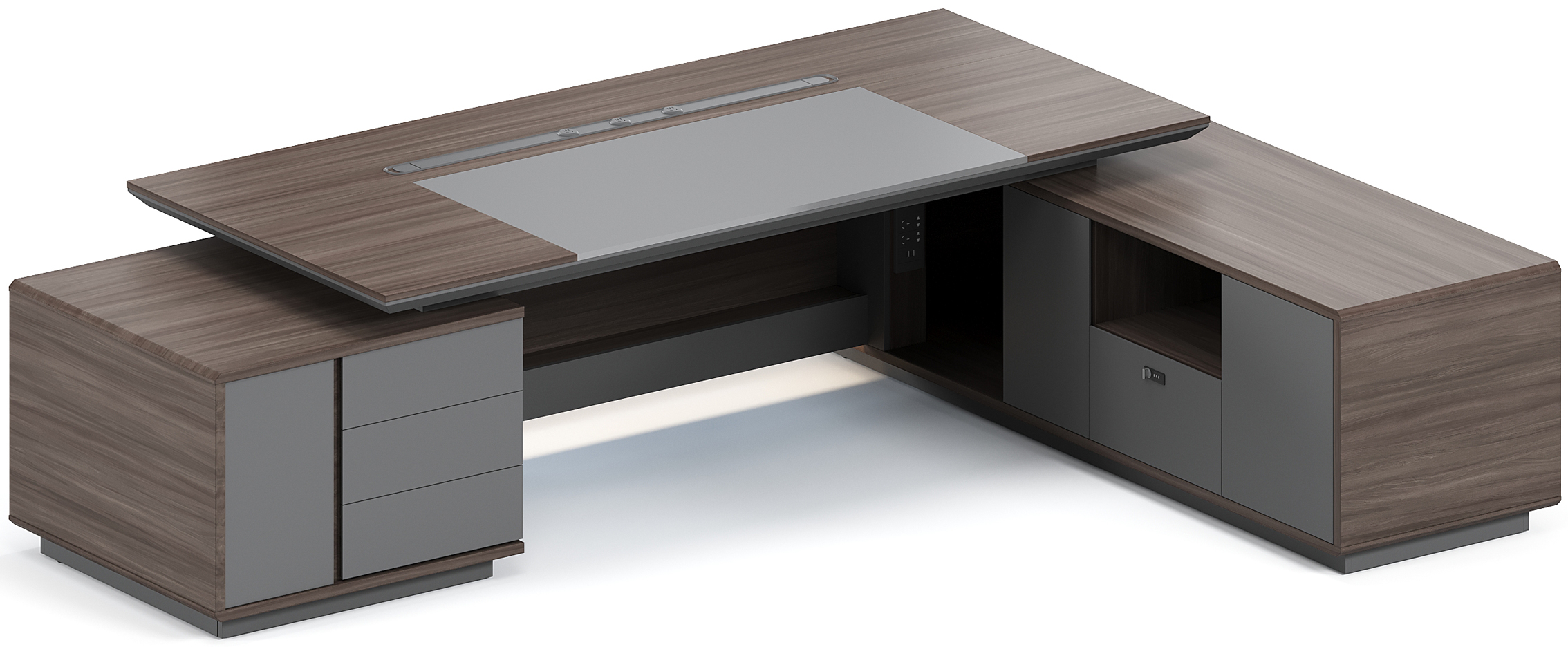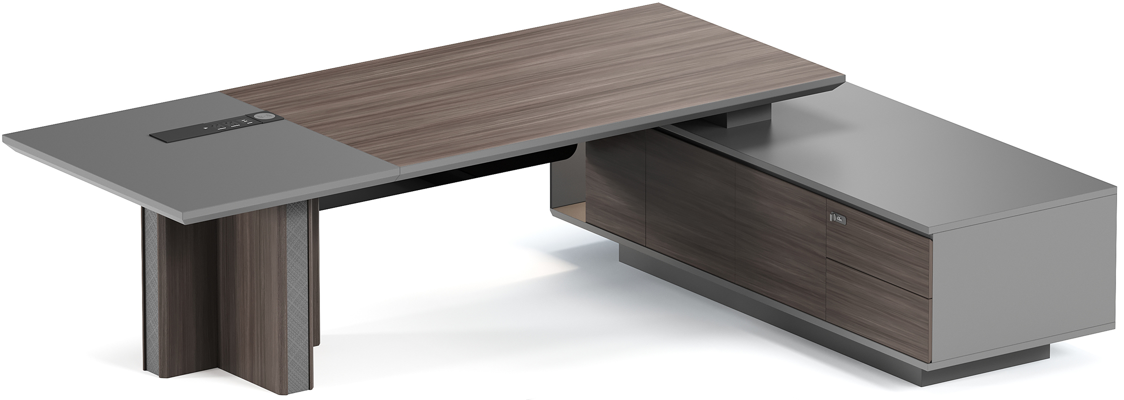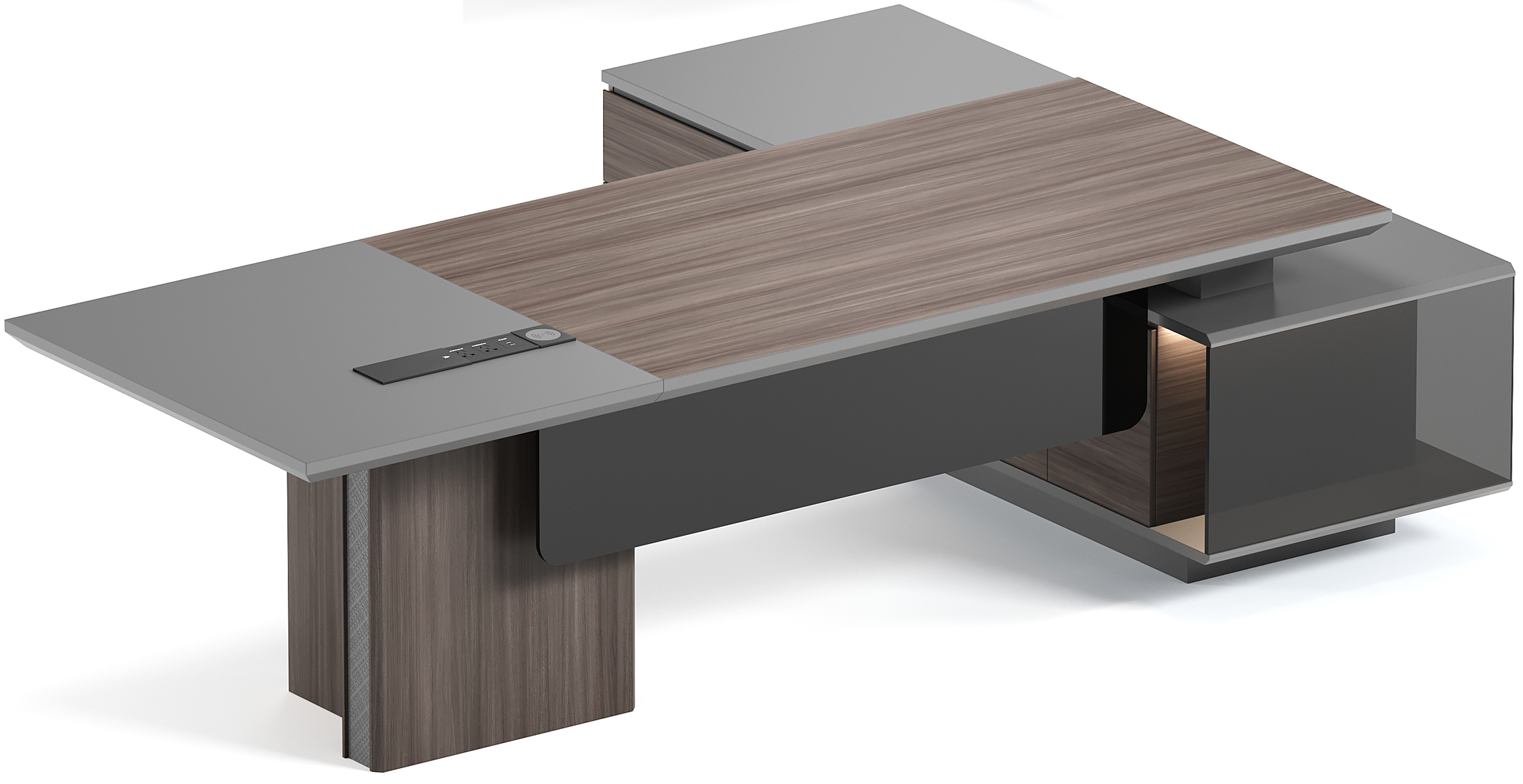 The ULTRA President Series features a solid wood base as its defining element. This executive desk is available in customizable sizes and includes a Universal Multi Smart Power Rail system, integrated cable management, and a lockable storage cabinet.