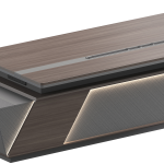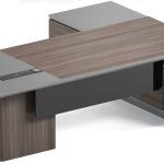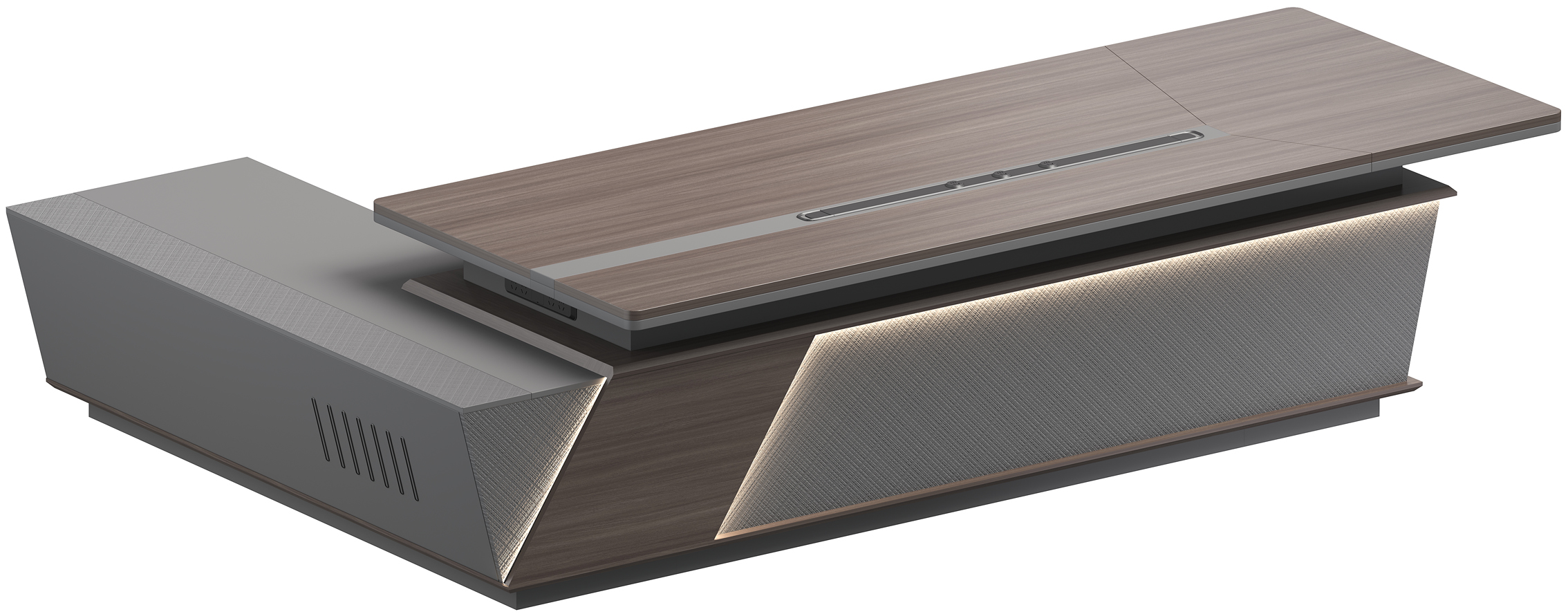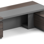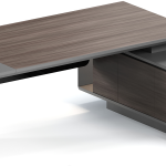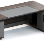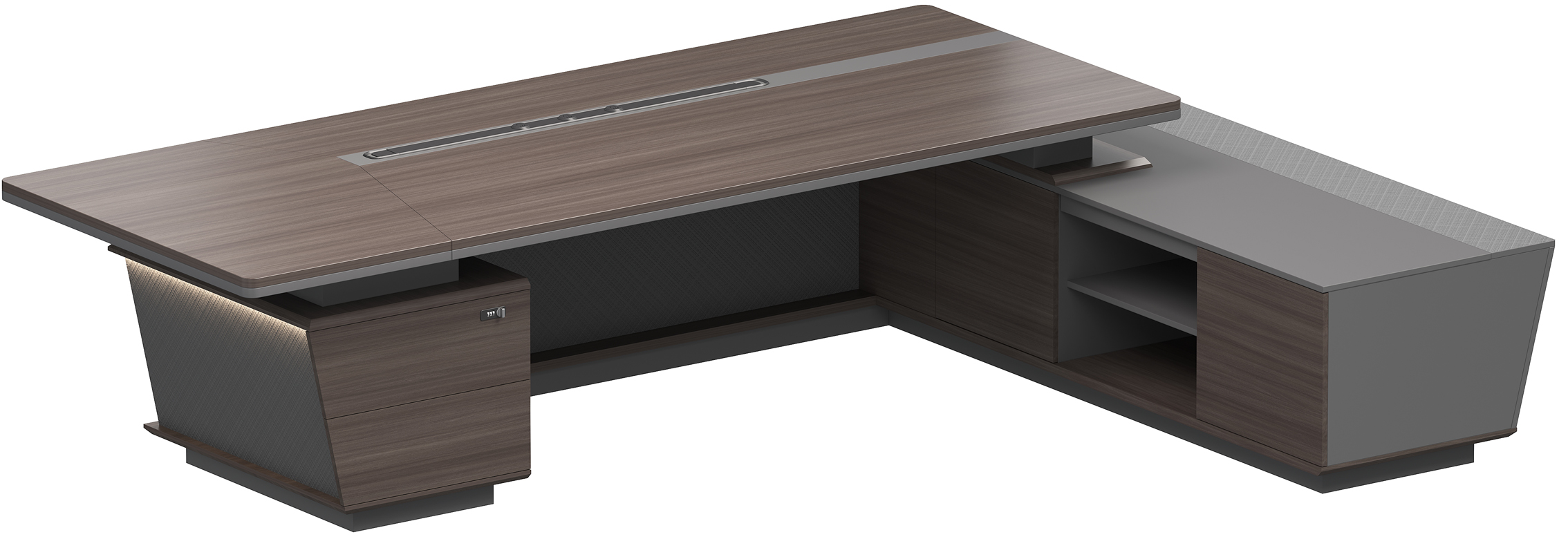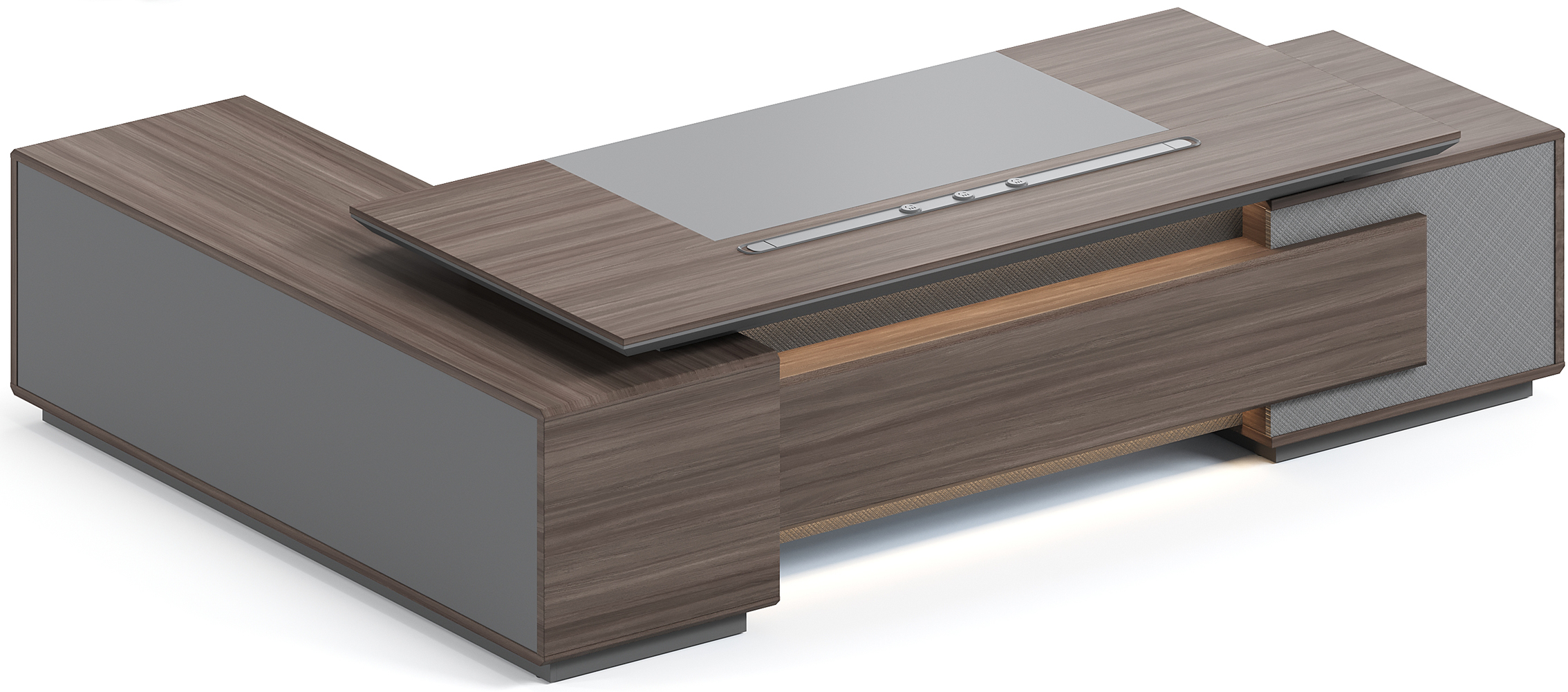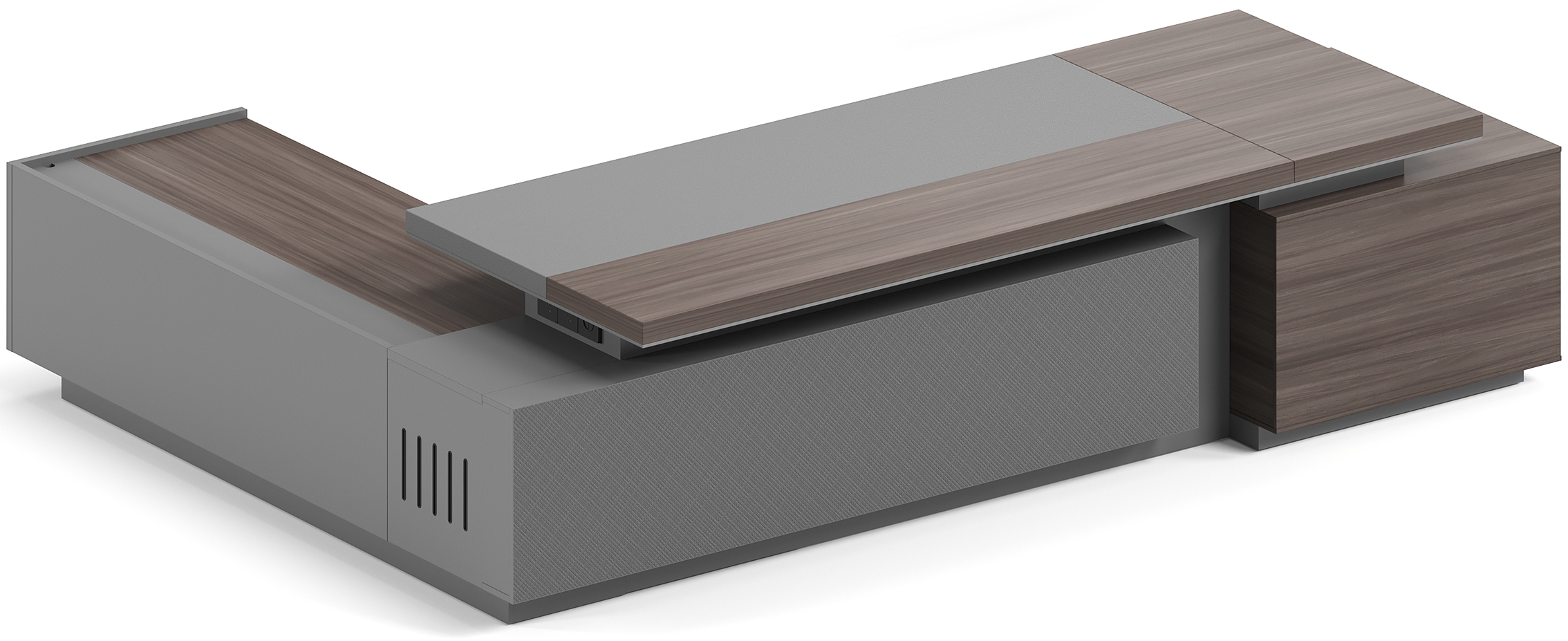 The ULTRA President Series features a solid wood base as its defining element. This executive desk is available in customizable sizes and includes a Universal Multi Smart Power Rail system, integrated cable management, and a lockable storage cabinet.